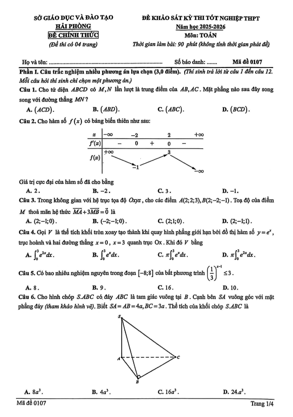 Đề khảo sát thi tốt nghiệp THPT 2026 môn Toán sở GD&ĐT Hải Phòng