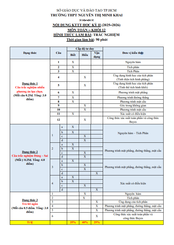Đề ôn tập HK2 Toán 12 năm 2025 – 2026 trường THPT Nguyễn Thị Minh Khai – TP HCM