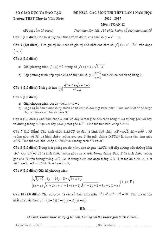 Khảo Sát Chất Lượng Toán 12 Đề khảo sát chất lượng môn Toán lớp 12 trường chuyên Vĩnh Phúc lần 1 12/10/2016