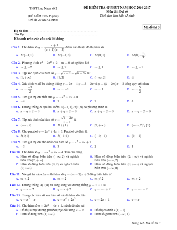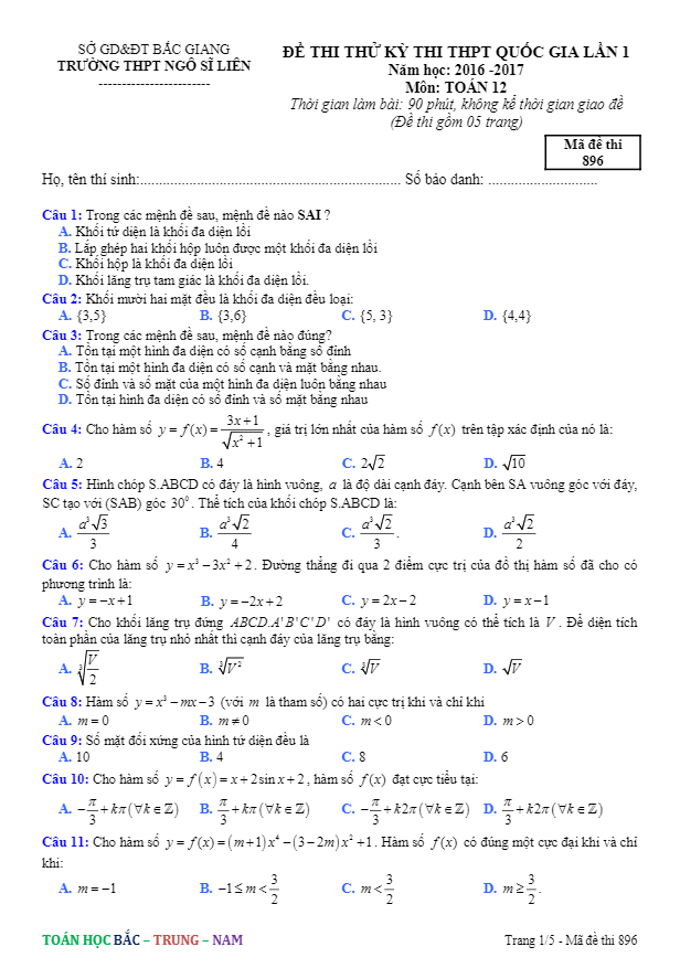 Đề Thi Thử THPT Môn Toán Đề thi thử THPT Quốc gia 2017 môn Toán trường Ngô Sĩ Liên – Bắc Giang lần 1 12/10/2016