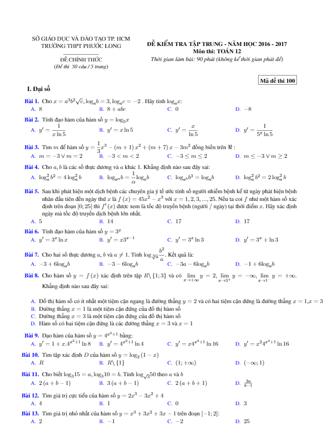 Đề Thi Thử THPT Môn Toán Đề kiểm tra tập trung môn Toán 12 trường THPT Phước Long – TP.HCM 07/12/2016