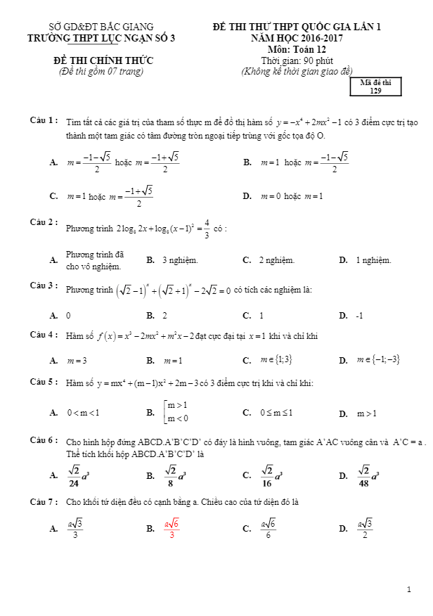 Đề Thi Thử THPT Môn Toán Đề thi thử THPT Quốc gia 2017 môn Toán trường Lục Ngạn 3 – Bắc Giang lần 1 05/12/2016