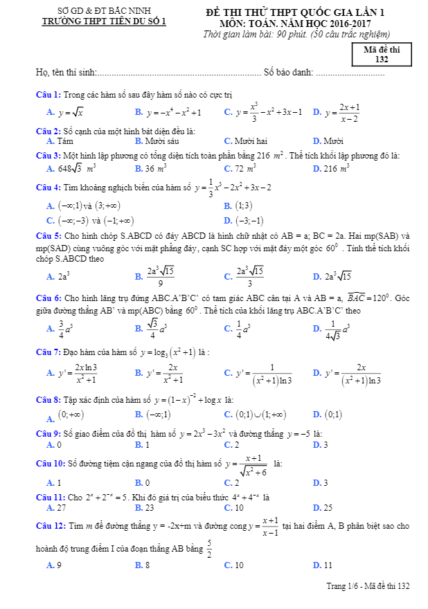 Đề Thi Thử THPT Môn Toán Đề thi thử THPT Quốc gia 2017 môn Toán trường Tiên Du 1 – Bắc Ninh lần 1 06/12/2016