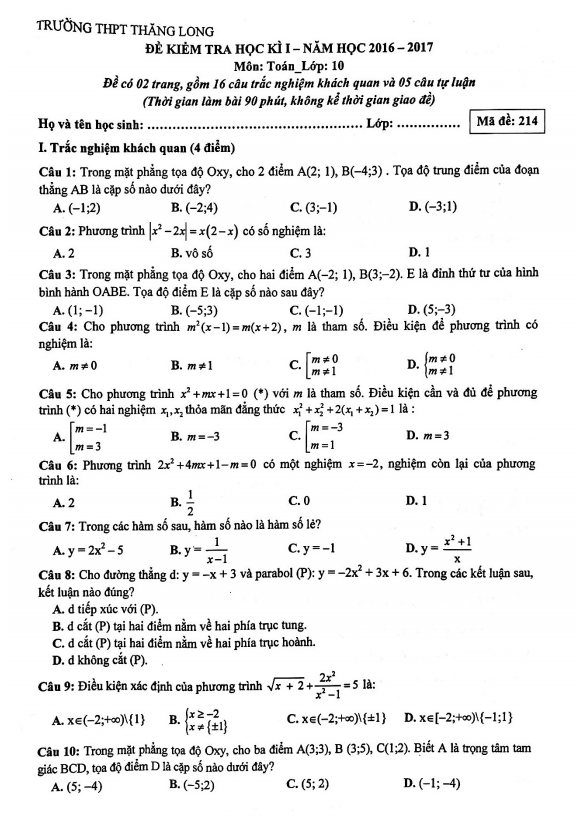 Đề Thi HK1 Toán 10 Đề thi học kì 1 Toán 10 năm 2016 – 2017 trường THPT Thăng Long – Hà Nội 06/12/2016