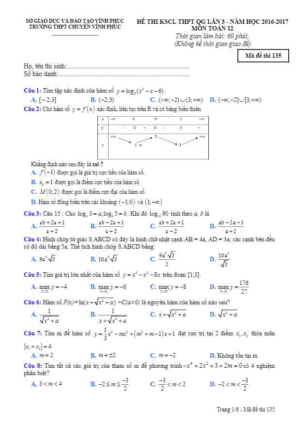 Đề Thi Thử THPT Môn Toán Đề thi thử THPT Quốc gia 2017 môn Toán trường chuyên Vĩnh Phúc lần 3 15/02/2017