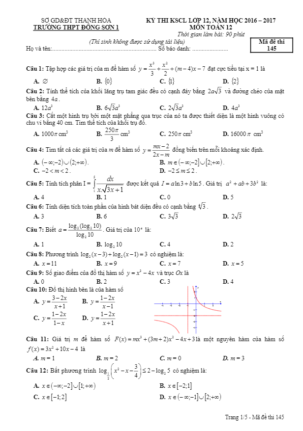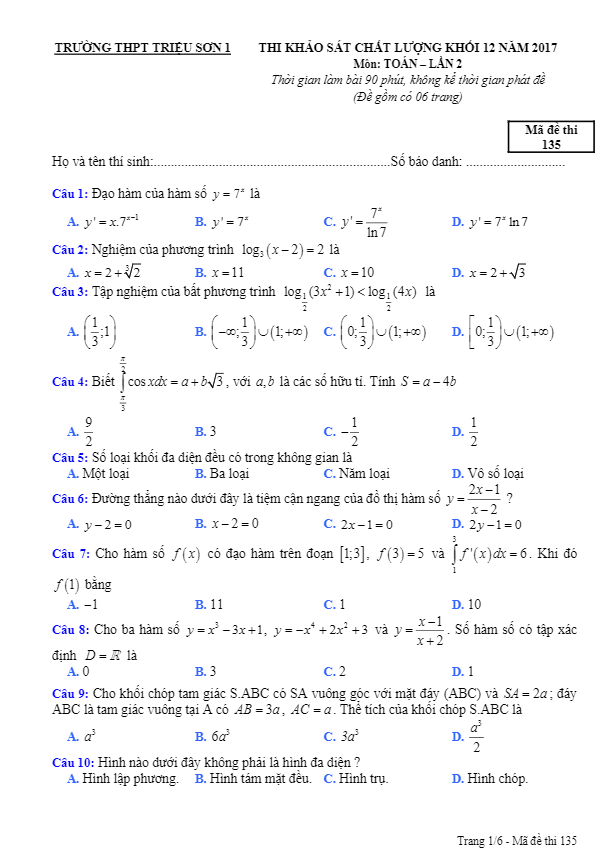 Đề Thi Thử THPT Môn Toán Đề thi thử THPT Quốc gia 2017 môn Toán trường THPT Triệu Sơn 1 – Thanh Hóa lần 2 16/02/2017