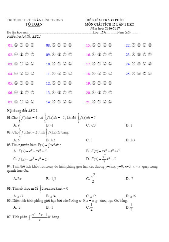 Kiểm Tra Giải Tích 12 Chương 3 Kiểm tra Giải tích 12 lần 1 HK2 năm 2016 – 2017 trường Trần Bình Trọng – Khánh Hòa 15/02/2017