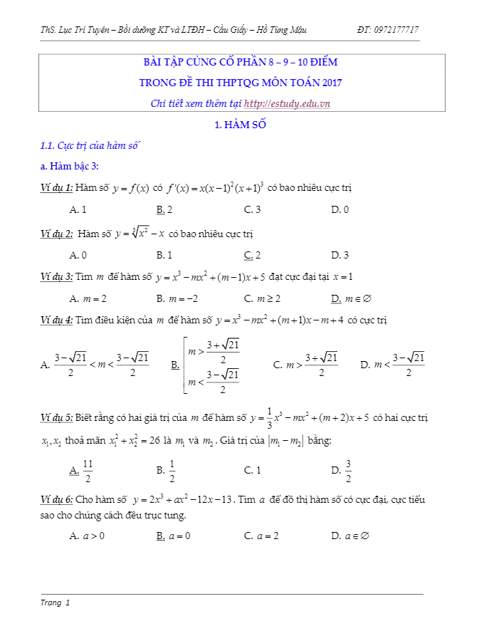 Tài Liệu Ôn Thi THPT Môn Toán Bài tập củng cố phần 8 – 9 – 10 điểm trong đề thi THPT Quốc gia 2017 môn Toán – Lục Trí Tuyên 12/06/2017