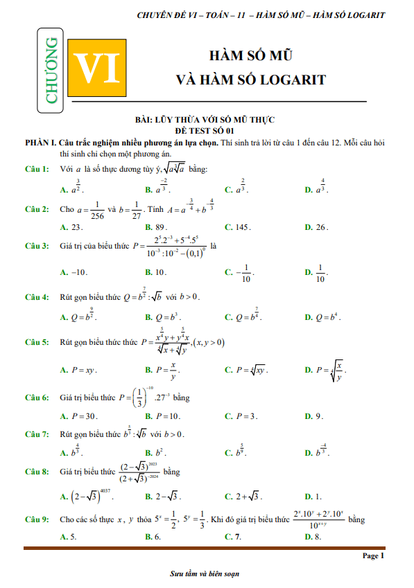 Luyện kỹ năng trắc nghiệm nhiều lựa chọn lũy thừa, mũ, logarit