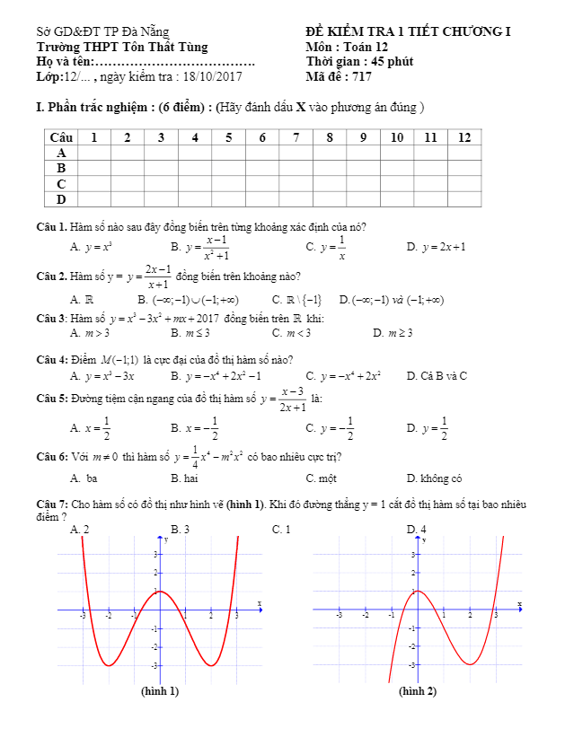 Kiểm Tra Giải Tích 12 Chương 1 Đề kiểm tra 1 tiết chương I Giải tích 12 (Hàm số) trường THPT Tôn Thất Tùng – Đà Nẵng 18/10/2017