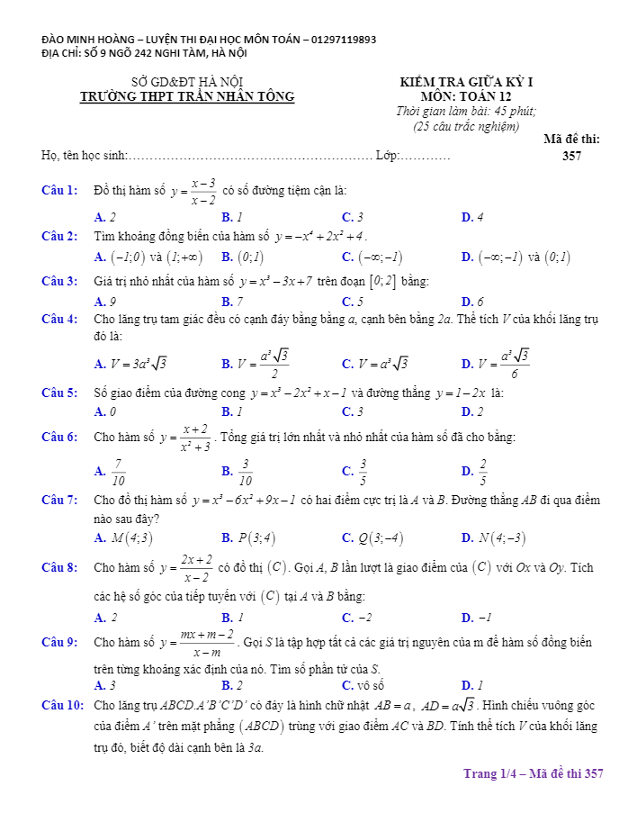 Đề Thi Giữa HK1 Toán 12 Đề kiểm tra giữa học kỳ I môn Toán 12 trường THPT Trần Nhân Tông – Hà Nội 13/10/2017