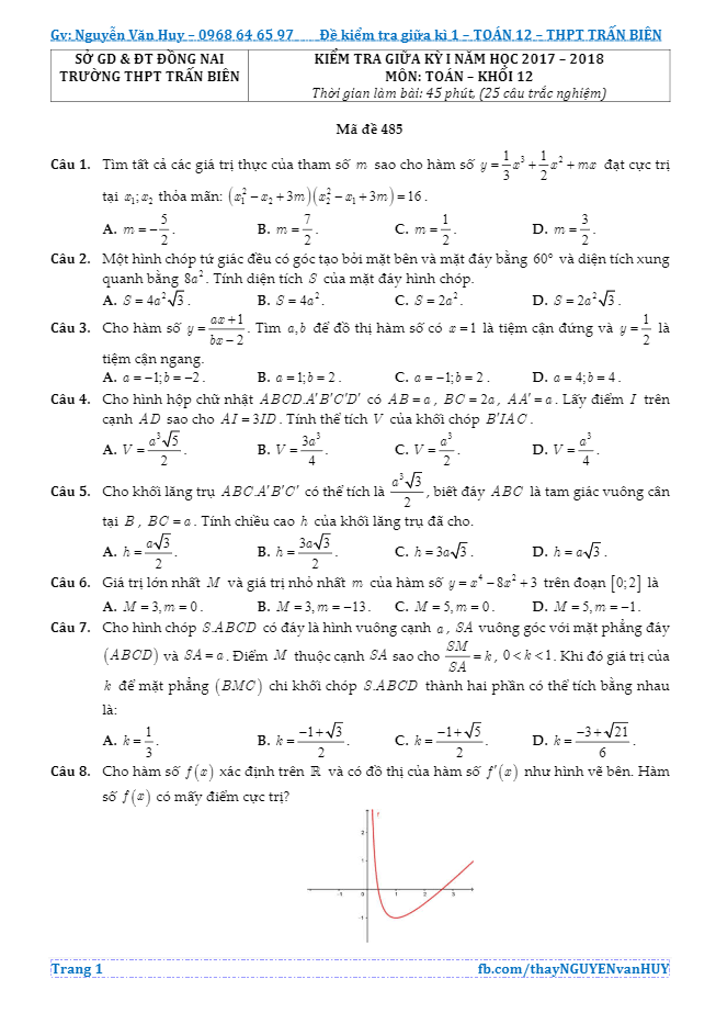 Đề Thi Giữa HK1 Toán 12 Đề kiểm tra giữa học kỳ I năm học 2017 – 2018 môn Toán 12 trường THPT Trấn Biên – Đồng Nai 12/10/2017