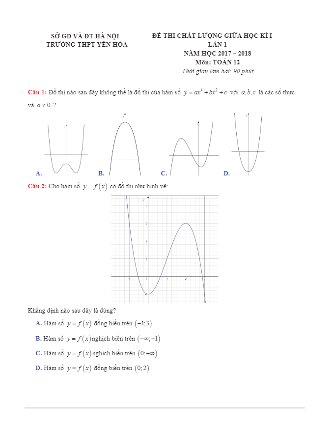 Đề Thi Giữa HK1 Toán 12 Đề thi chất lượng giữa học kỳ I năm học 2017 – 2018 môn Toán lớp 12 trường THPT Yên Hòa – Hà Nội 13/10/2017