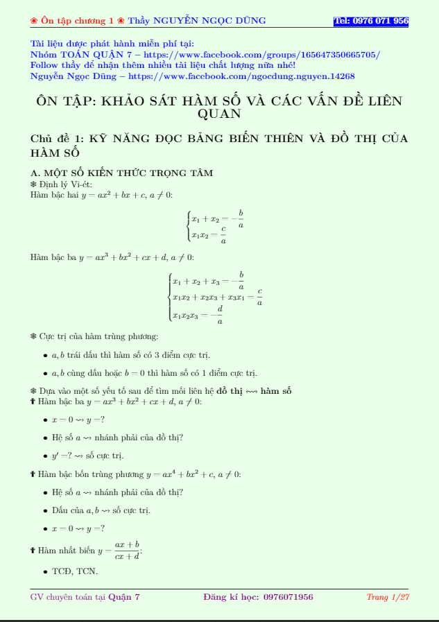 Khảo Sát Và Vẽ Đồ Thị Hàm Số 100 bài tập trắc nghiệm rèn luyện kỹ năng đọc bảng biến thiên và đồ thị của hàm số – Nguyễn Ngọc Dũng 09/10/2017