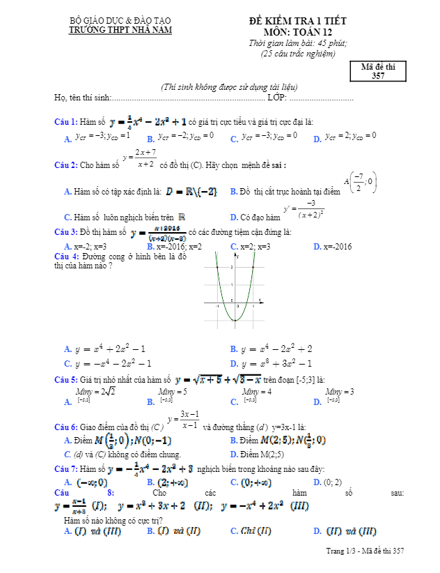 Kiểm Tra Giải Tích 12 Chương 1 Đề kiểm tra 1 tiết Giải tích 12 chương 1 (Hàm số) trường THPT Nhã Nam – Bắc Giang 10/10/2017