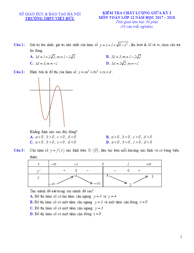 Đề Thi Giữa HK1 Toán 12 Đề kiểm tra chất lượng giữa kỳ I môn Toán 12 năm học 2017 – 2018 trường THPT Việt Đức – Hà Nội 06/10/2017