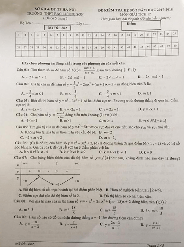 Kiểm Tra Giải Tích 12 Chương 1 Đề kiểm tra hệ số 2 năm học 2017 – 2018 môn Giải tích 12 chương 1 trường THPT Bắc Lương Sơn – Hà Nội 07/10/2017