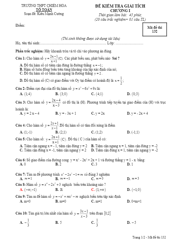 Kiểm Tra Giải Tích 12 Chương 1 Đề kiểm tra một tiết Giải tích 12 chương 1 (Hàm số) trường THPT Chiêm Hóa – Tuyên Quang 07/10/2017