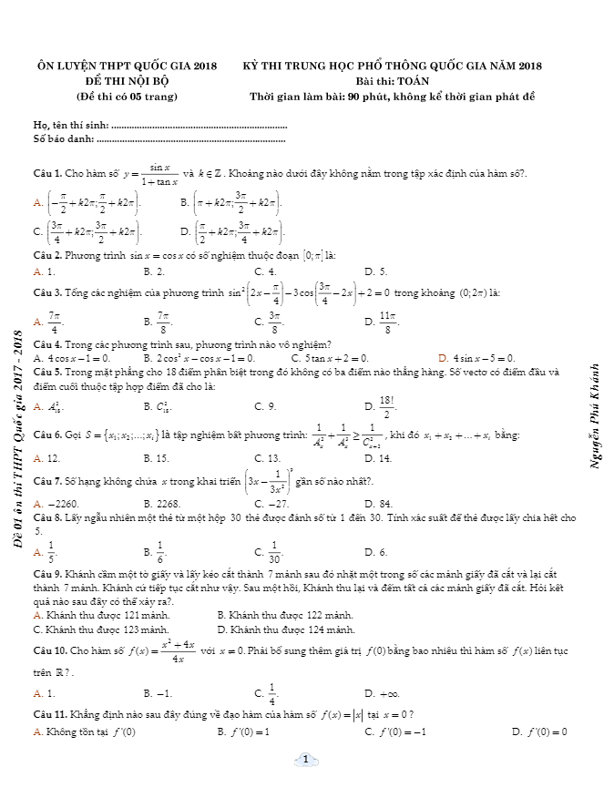 Nguyên Hàm – Tích Phân Tổng hợp 414 bài tập trắc nghiệm nguyên hàm trong đề thi thử có đáp án – Trần Văn Tài 09/10/2017