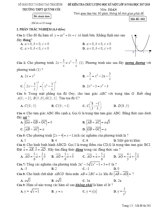 Đề Thi HK1 Toán 10 Đề kiểm tra chất lượng HK1 Toán 10 năm học 2017 – 2018 trường THPT Quỳnh Côi – Thái Bình 28/12/2017