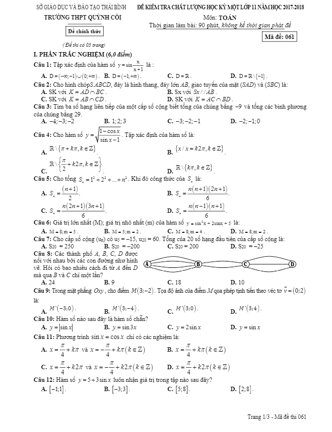 Đề Thi HK1 Toán 11 Đề kiểm tra chất lượng HK1 Toán 11 năm học 2017 – 2018 trường THPT Quỳnh Côi – Thái Bình 28/12/2017