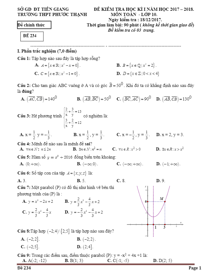Đề Thi HK1 Toán 10 Đề thi HK1 Toán 10 năm học 2017 – 2018 trường THPT Phước Thạnh – Tiền Giang 26/12/2017