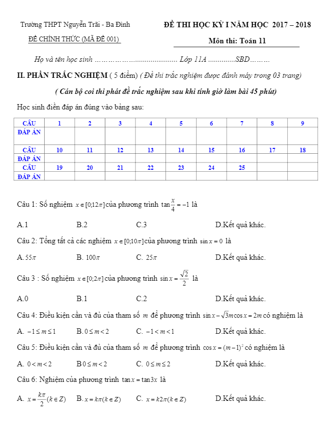 Đề Thi HK1 Toán 11 Đề thi HK1 Toán 11 năm học 2017 – 2018 trường THPT Nguyễn Trãi – Hà Nội 26/12/2017