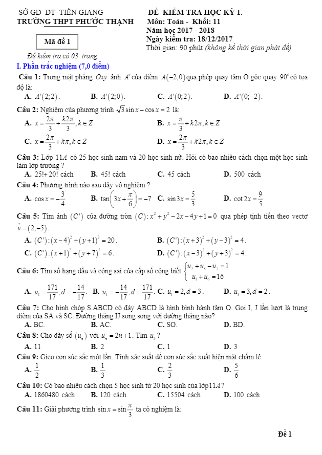 Đề Thi HK1 Toán 11 Đề thi HK1 Toán 11 năm học 2017 – 2018 trường THPT Phước Thạnh – Tiền Giang 26/12/2017