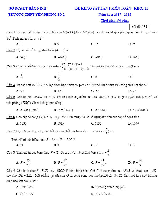 Đề khảo sát Toán 11 lần 1 năm học 2017 – 2018 trường THPT Yên Phong 1 – Bắc Ninh