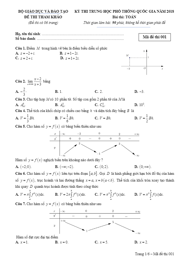Đề minh họa môn Toán 2018