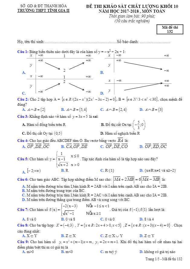 Đề thi KSCL Toán 10 năm học 2017 – 2018 trường THPT Tĩnh Gia 2 – Thanh Hóa