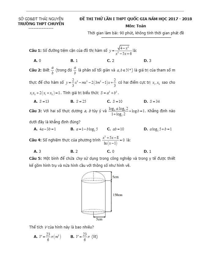 Đề thi thử môn Toán 2018 THPT Quốc gia trường THPT chuyên Thái Nguyên lần 1