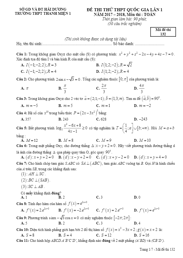 Đề thi thử môn Toán 2018 THPT Quốc gia trường THPT Thanh Miện 1 – Hải Dương lần 1