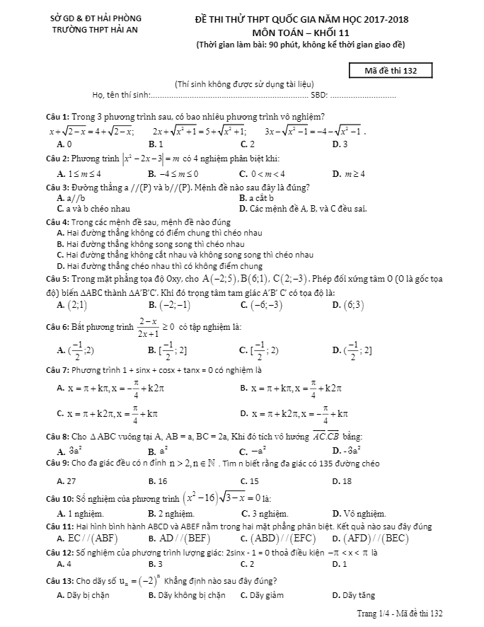Đề thi thử THPT Quốc gia năm 2017 – 2018 môn Toán 11 trường Hải An – Hải Phòng