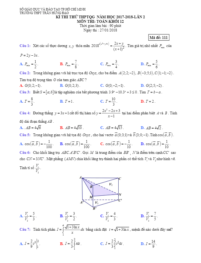 Đề thi thử THPTQG 2018 môn Toán trường THPT Trần Hưng Đạo – TP. HCM lần 2