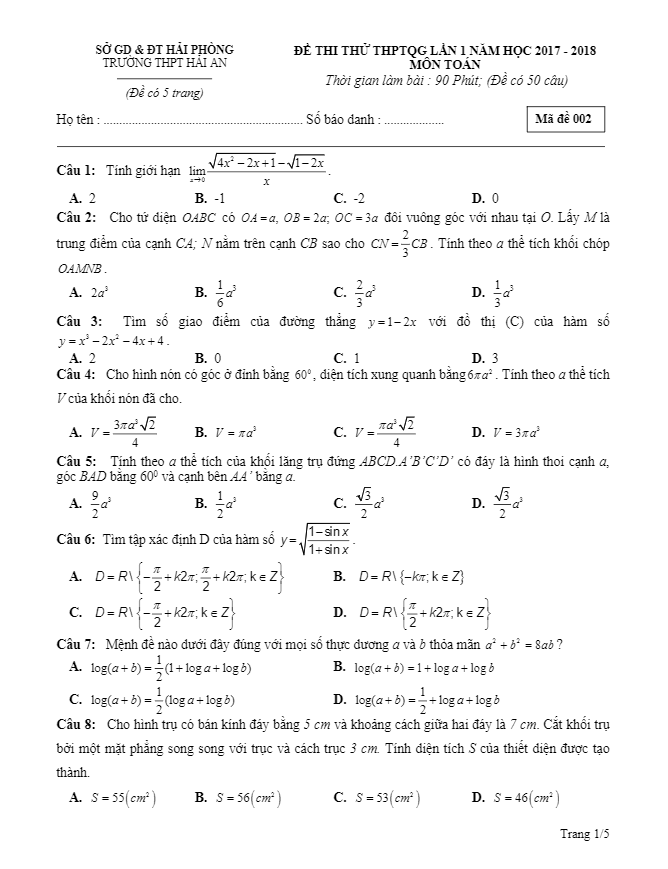 Đề thi thử THPTQG môn Toán lần 1 năm 2017 – 2018 trường Hải An – Hải Phòng