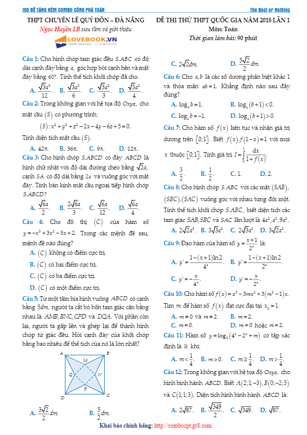 Đề thi thử Toán 2018 lần 1 trường THPT chuyên Lê Quý Đôn – Đà Nẵng
