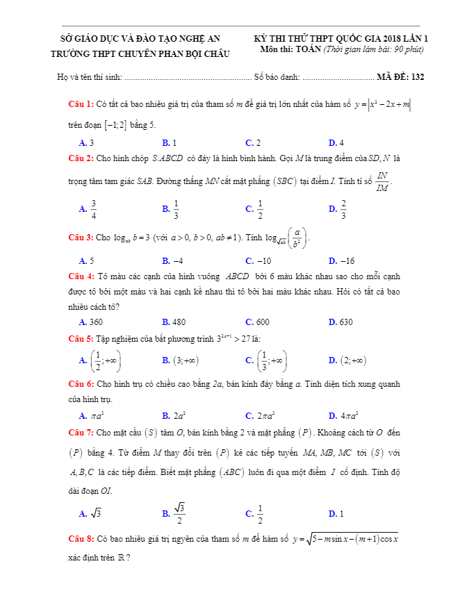Đề thi thử Toán 2018 THPT Quốc gia trường THPT chuyên Phan Bội Châu – Nghệ An
