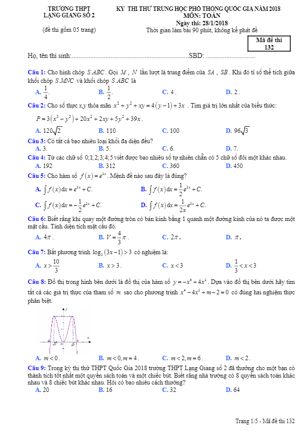 Đề thi thử Toán 2018 THPT Quốc gia trường THPT Lạng Giang – Bắc Giang