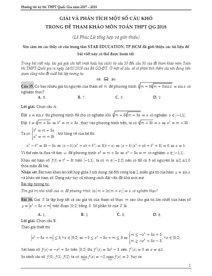 Giải và phân tích một số câu khó trong đề tham khảo môn toán THPT QG 2018 – Lê Phúc Lữ