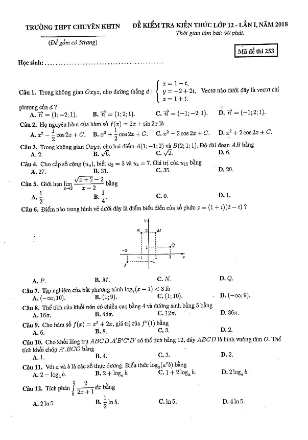 Đề Thi Thử THPT Môn Toán Đề kiểm tra kiến thức Toán 12 lần 1 năm 2018 trường THPT chuyên KHTN – Hà Nội 15/01/2018