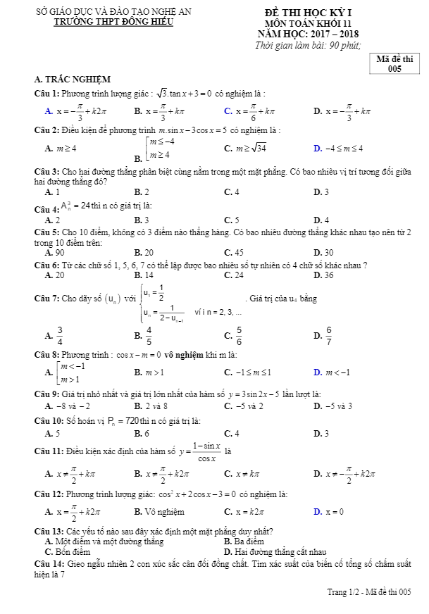 Đề Thi HK1 Toán 11 Đề thi học kỳ 1 Toán 11 năm học 2017 – 2018 trường THPT Đông Hiếu – Nghệ An 16/01/2018