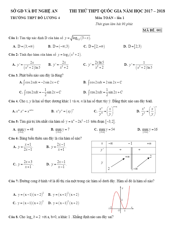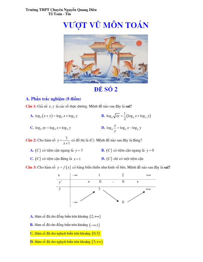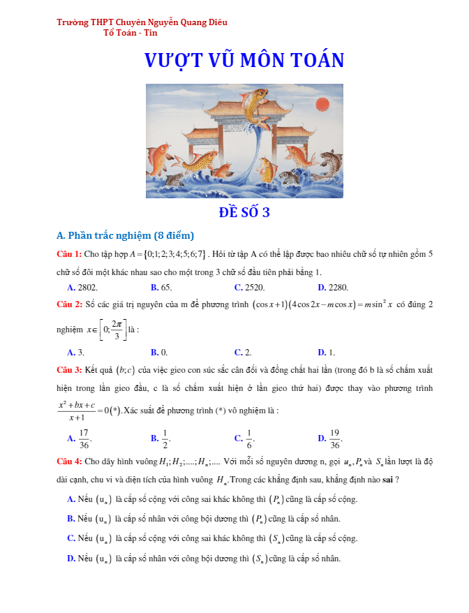 Đề Thi Thử THPT Môn Toán Đề vượt vũ môn Toán 2018 lần 1 trường THPT chuyên Nguyễn Quang Diêu – Đồng Tháp 20/01/2018