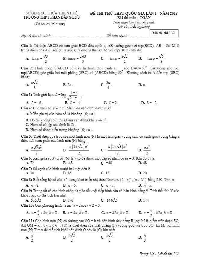 Đề Thi Thử THPT Môn Toán Đề thi thử môn Toán 2018 THPT Quốc gia trường THPT Phan Đăng Lưu – TT. Huế lần 1 15/01/2018