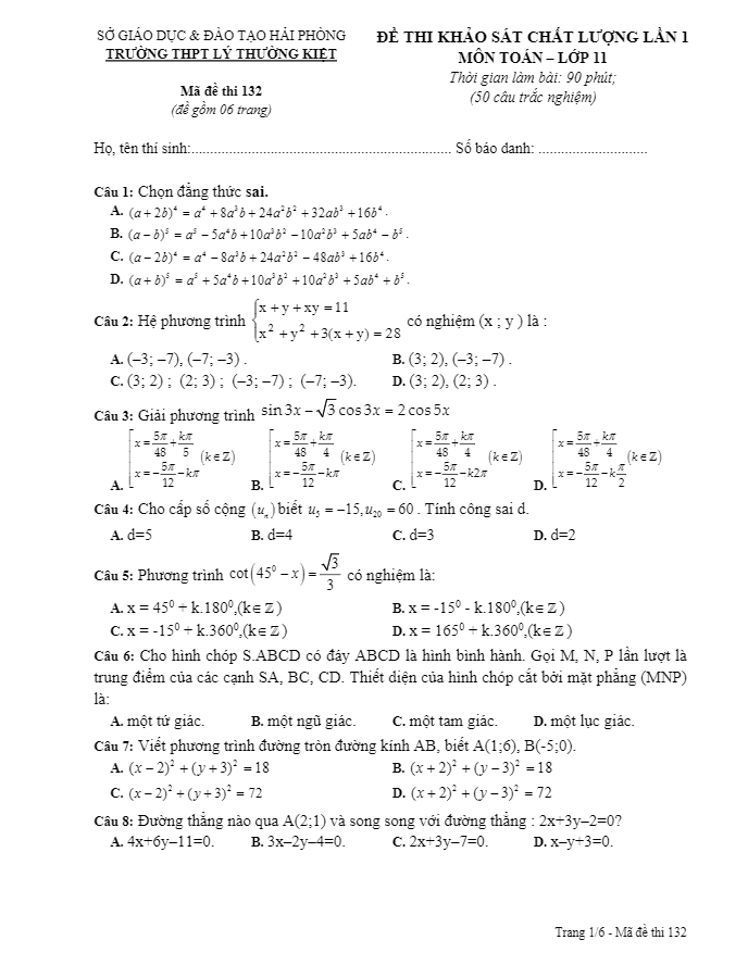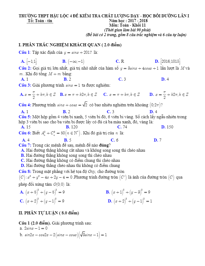 Khảo Sát Chất Lượng Toán 11 Đề kiểm tra chất lượng dạy – học Toán 11 lần 1 năm 2017 – 2018 trường Hậu Lộc 4 – Thanh Hóa 10/01/2018