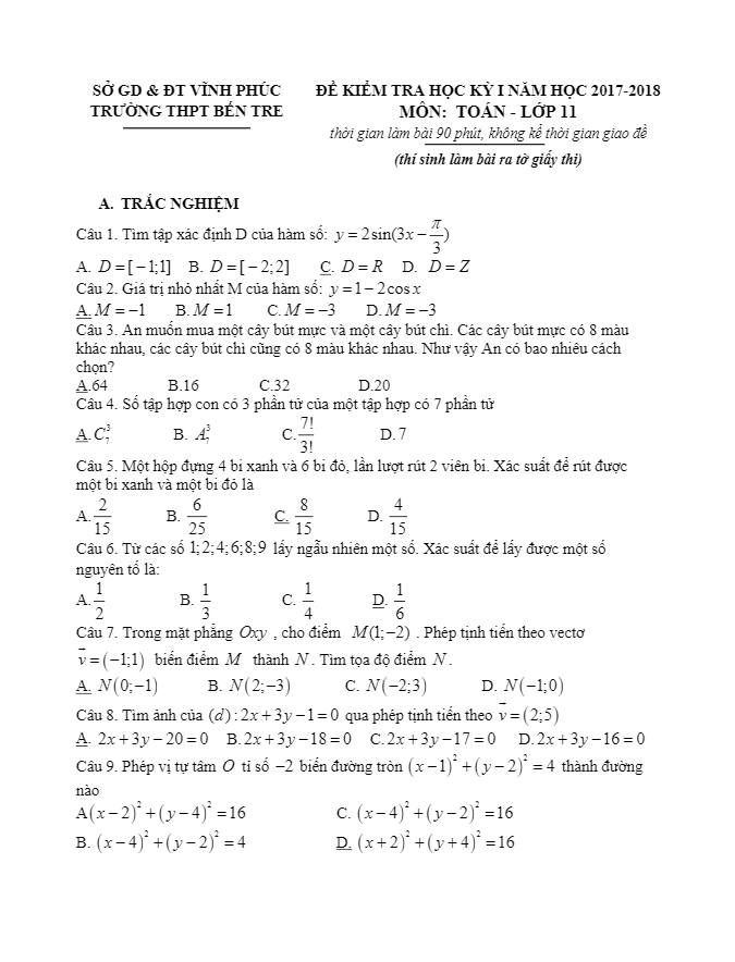 Đề Thi HK1 Toán 11 Đề thi học kỳ 1 Toán 11 năm học 2017 – 2018 trường THPT Bến Tre – Vĩnh Phúc 10/01/2018