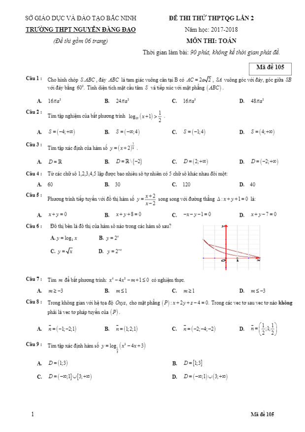 Đề Thi Thử THPT Môn Toán Đề thi thử môn Toán 2018 THPT Quốc gia trường THPT Nguyễn Đăng Đạo – Bắc Ninh lần 2 13/01/2018