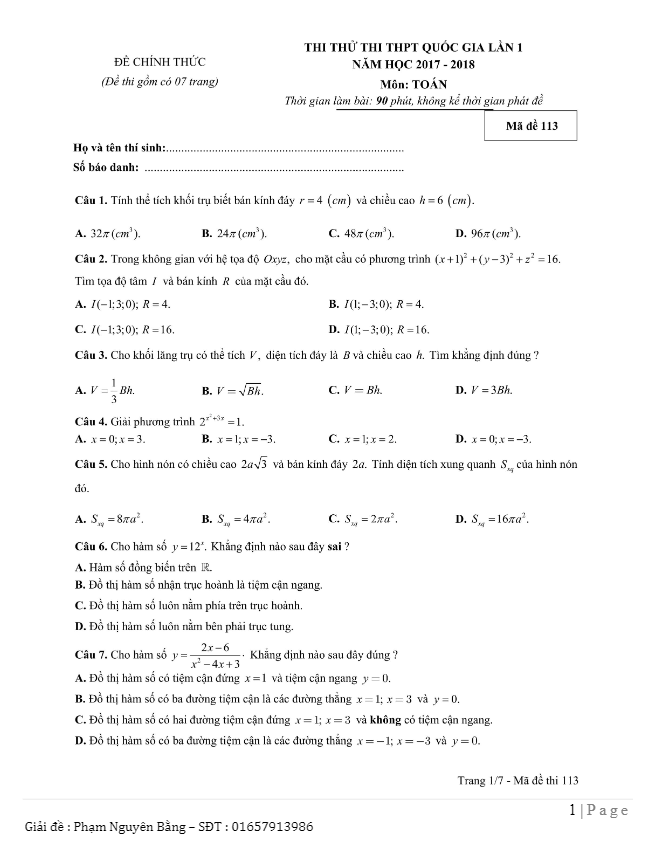 Đề Thi HK1 Toán 12 Đề kiểm tra học kỳ 1 Toán 12 năm học 2017 – 2018 trường THPT Thanh Chương 1 – Nghệ An 09/01/2018