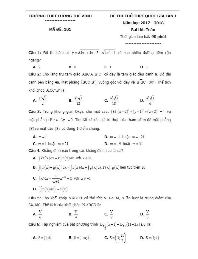 Đề Thi Thử THPT Môn Toán Đề thi thử THPT Quốc gia 2018 môn Toán trường THPT Lương Thế Vinh – Hà Nội lần 1 13/01/2018