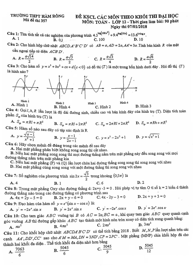 Đề Thi Thử THPT Môn Toán Đề thi thử Toán 2018 THPT Quốc gia trường THPT Hàm Rồng – Thanh Hóa 11/01/2018